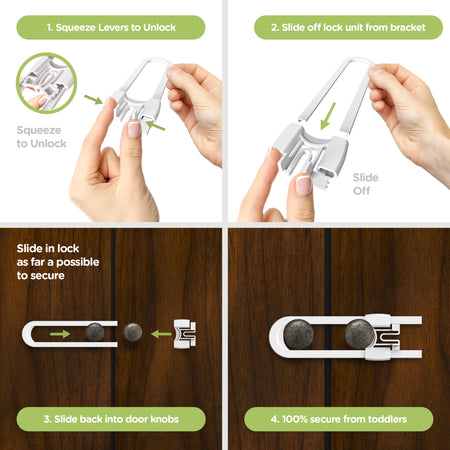 Our cabinet locks are fused with a smart mechanism which is simple to decode for adults and hard for kids to figure out. It unlocks with a simple one-touch press - kids won't be able to know how to slide the button open, but it's a cinch for adults.